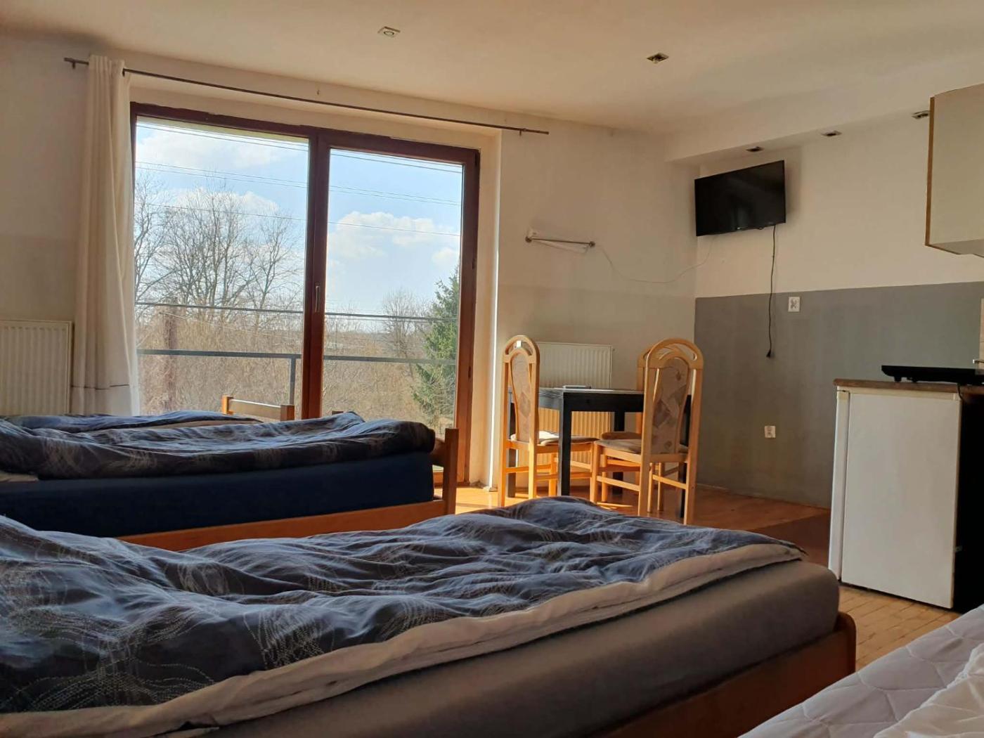 Pokój rodzinny. The family room features parquet floors, heating, as well as a private bathroom boasting a shower. The fully equipped kitchenette has a stovetop, a refrigerator and an electric kettle. This family room offers a flat-screen TV. The unit has 4 beds. Rodzinny - 4 osobowy. Powierzchnia pokoju ok.: 27 mkw. ;